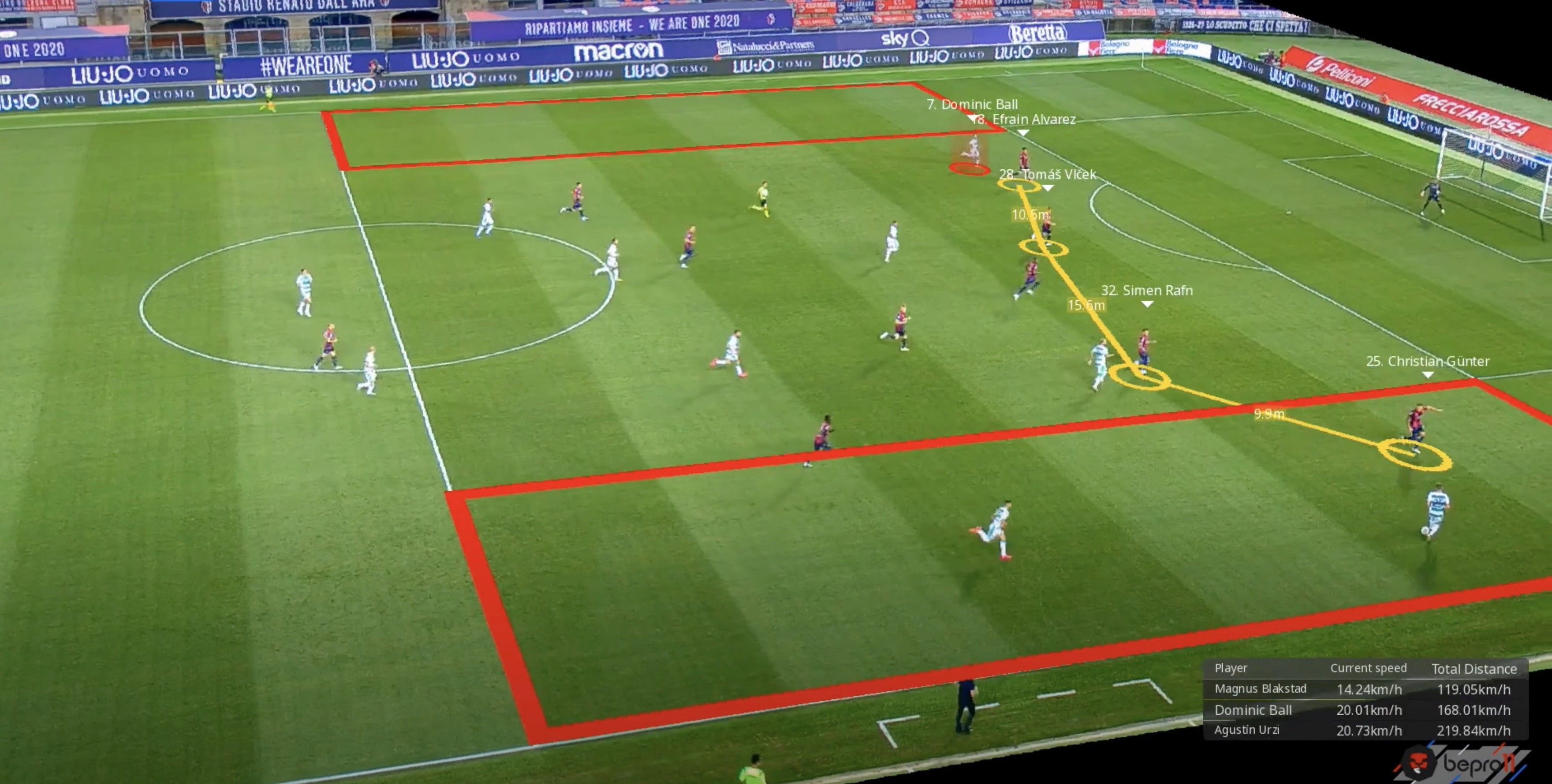 Wenn Sie das optische Tracking-Paket von Bepro verwenden, können Sie automatisierte Tracking-Visualisierungen wie Scheinwerfer, Linien und sogar Entfernungen zwischen den Spielern für Spiele einfügen, die wir optisch verfolgt haben. Wenn Sie noch kein Kunde von optischem Tracking sind, nehmen Sie bitte Kontakt mit uns auf, indem Sie unser Kontaktformular ausfüllen.