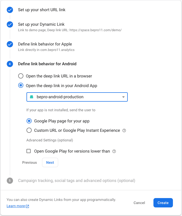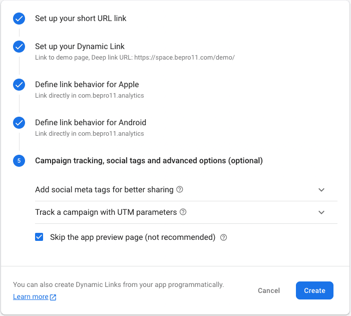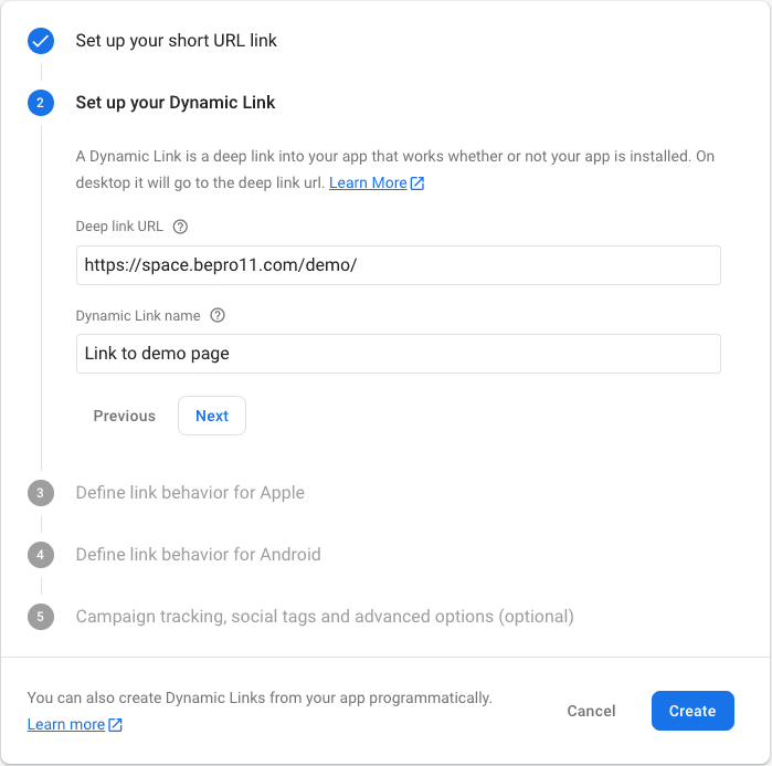This can be easily completed when following the guide provided by Firebase. Let’s briefly look at the dynamic link creation method under the premise that the app has been added.