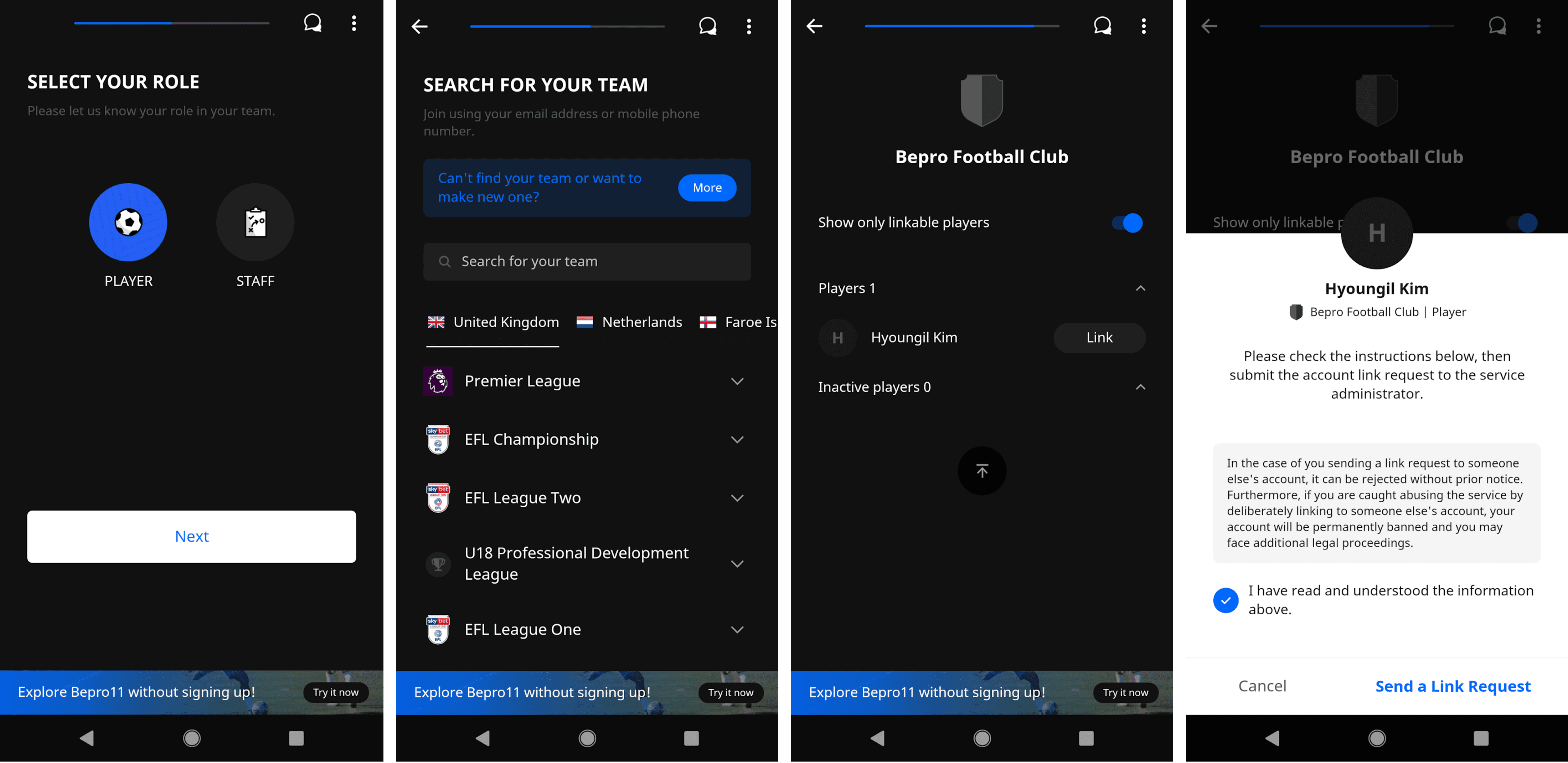 Nevertheless, just like general B2C services, it is impossible for general users to sign-up and immediately use the service. Even players and coaches belonging to a client club must verify their identity while signing up before linking their ID to their profile generated in their team. Hence, it is not easy for a potential user who has discovered BEPRO themselves to experience the service right away.