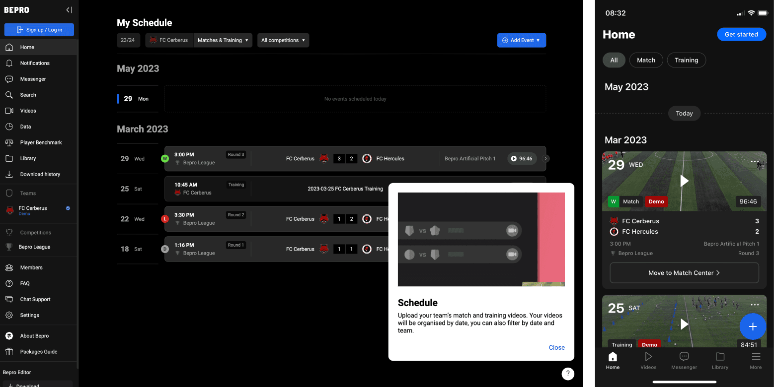 Darin findest du drei Beispielspiele und eine Trainingseinheit. Dazu gehören Videos, die mit einem BEPRO Kamerasystem und einem Camcorder aufgenommen wurden, damit du einen Eindruck bekommst, wie BEPRO dir und deinem Team helfen kann.