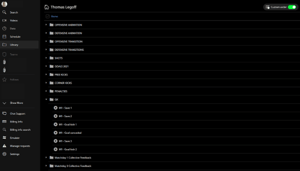 A library is a tool that can help you organise your training session footage. You are then free to determine who sees which file. For instance, in the GK file below, our user would only share the file with their three goalkeepers and the GK coach.