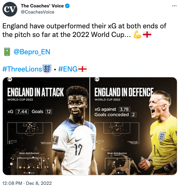 The Coaches Voice, an UK-based online coaching platform followed by over 250k people across Twitter and Instagram, used our Expected Goals data to highlight England’s performances at both ends of the pitch, as they scored more and conceded fewer than you’d expect.