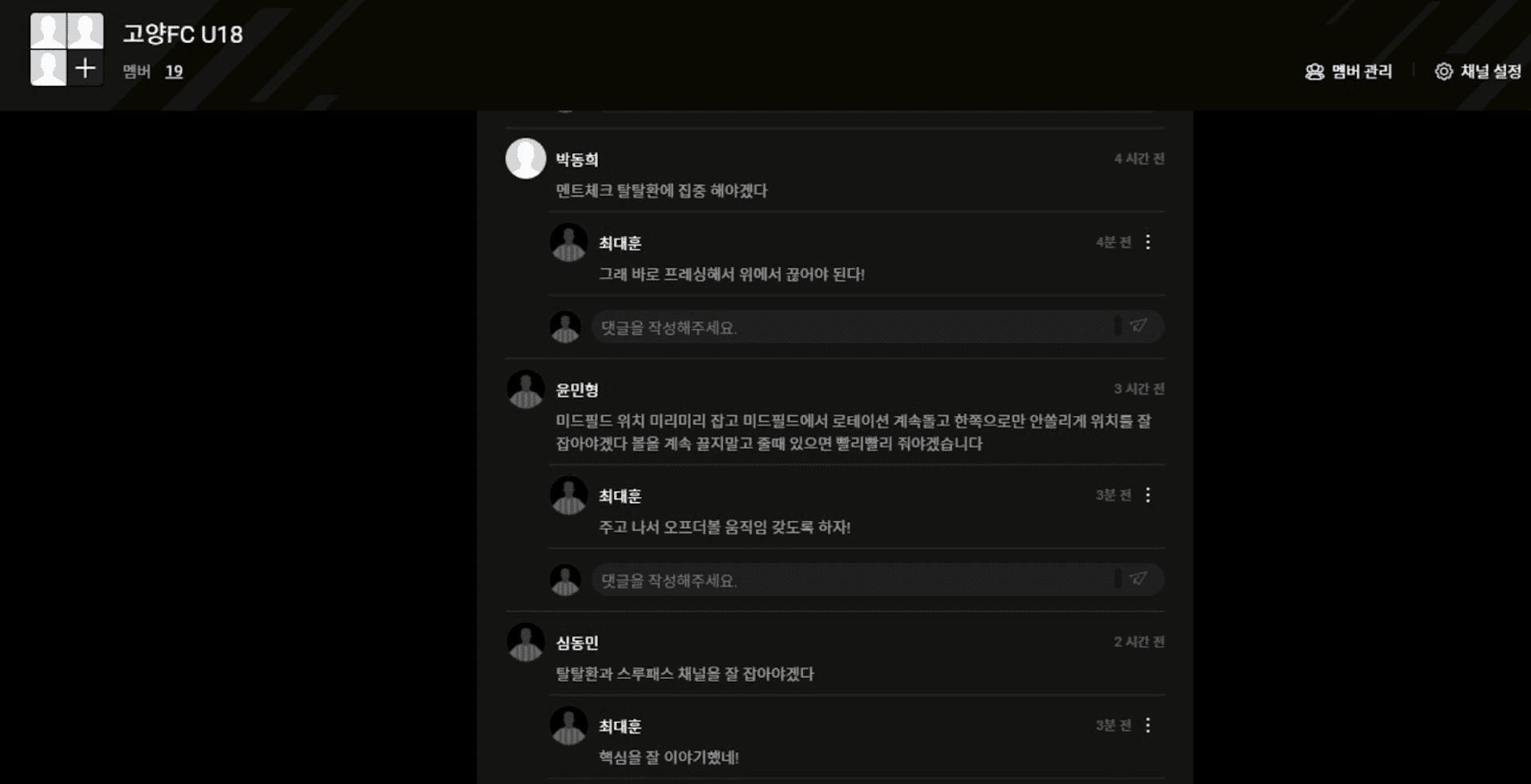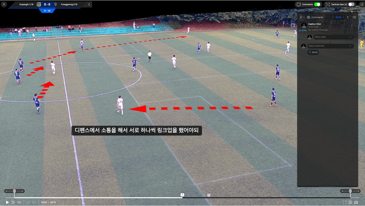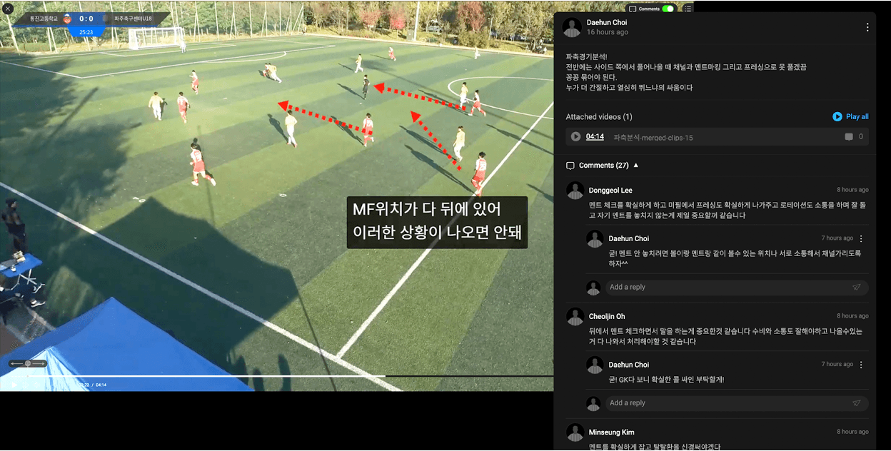 Le Goyang FC U18 ne tient pas de réunions d'équipe comme nous l'imaginerions. Au lieu de cela, ils les ont remplacées par une réunion en ligne où ils regardent des vidéos, filmées automatiquement avec une caméra BEPRO, à l'intérieur de la messagerie BEPRO. Ici, ils donnent et reçoivent des commentaires, revoient le jeu et regardent la vidéo du jeu de l'adversaire pour se préparer.