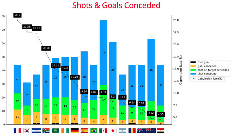 Mexico faced the highest number of shots and shots on target of any team, although this did not prevent them from progressing to the semi-finals, perhaps this is thanks to some nice finishing, which we look at next...