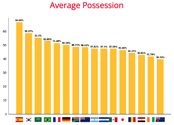 Given the playing styles mentioned above, it’s no surprise to see Spain had an average of 67% possession. The Spanish were comfortably the side who held on the ball the best throughout the competition, with the next highest nation, South Korea, seeing 59%. Spain also had the highest number of 10+ pass sequences, with 145, over double the Japanese who came in second. Spain saw the highest pass completion rate.