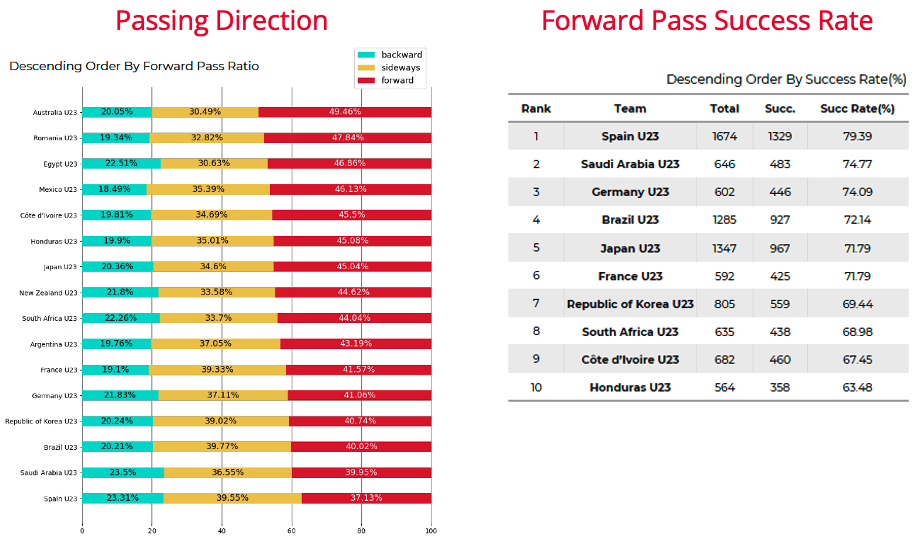 Looking at passing direction also provides context on playing styles. Australia played the highest proportion of their passes forward, although they were outside of the top 10 in terms of completing these passes successfully. Conversely Spain were the happiest to play the ball backwards whilst enjoying the highest forward pass success rate.
