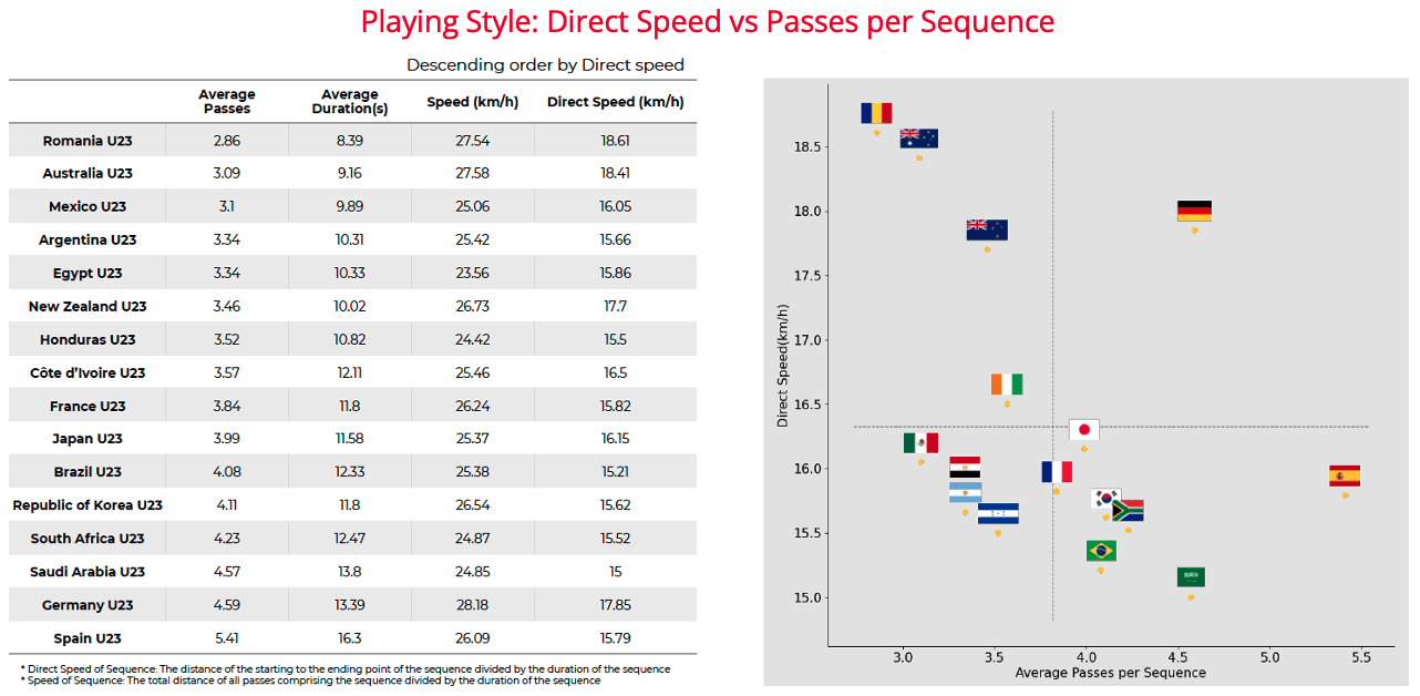 Three of the four semi finalists utilised a more pass-heavy approach compared to the average seen at the tournament, with Mexico representing an exception playing fewer passes each sequence. All four played with a below average direct speed.