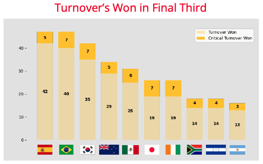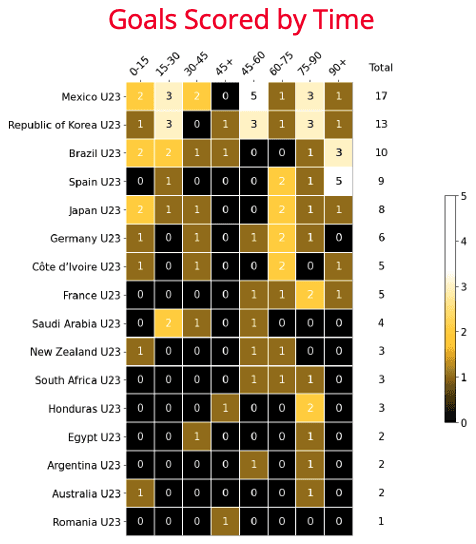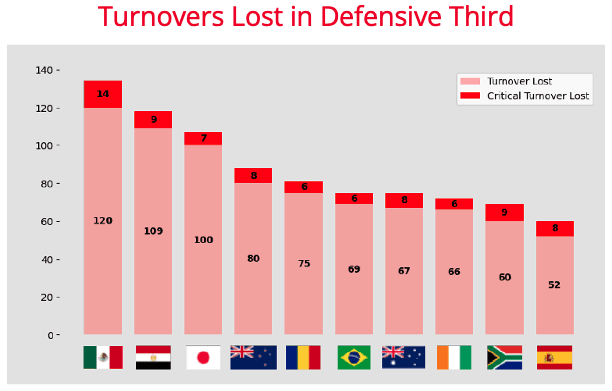 By also considering turnovers high up the pitch we can get an idea of how much pressure a team is putting on their opposition. Spain, Brazil and South Korea lead here, indicating that they both play high up the pitch and work to gain possession in the final third. These three teams also played the highest proportion of their passes in the final third of all teams at Tokyo 2020.