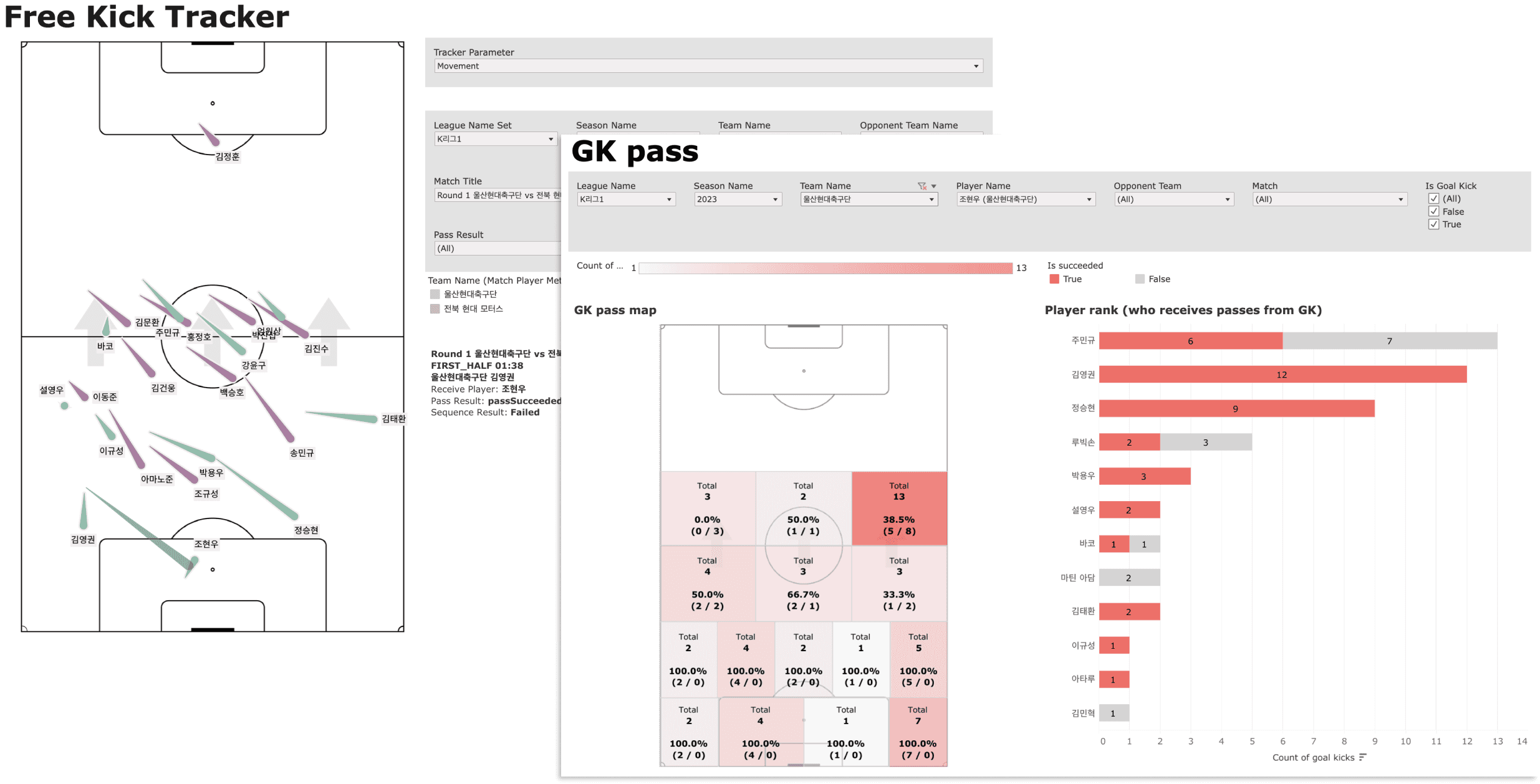 Certains de ces domaines d'intérêt pour le club n'étaient peut-être pas surprenants, avec des rapports élaborés pour des éléments tels que les coups de pied arrêtés et les tirs. Ulsan cherchait également à obtenir plus d'informations sur certains sujets de football moins prévisibles, notamment les passes des gardiens de but et les pertes de possession. Grâce à une consultation continue, des rapports initiaux ont été élaborés pour couvrir tous ces domaines d'intérêt et développés sur la base des commentaires partagés. Les données d'événements et de suivi ont été utilisées ensemble pour certains rapports, ce qui a été facilité par le fait que BEPRO fournit les deux types de données.