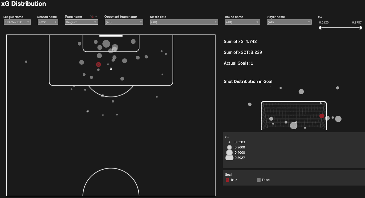 L'effectif de la Belgique offrait beaucoup d'expérience, mais n'a offert qu'un seul but, le plus bas à égalité de n'importe quelle équipe au tournoi. Ils ont eu beaucoup de tirs (35), avec neuf atteignant la cible. Leur valeur totale cumulée de buts attendus (xG) de 4.742 montre que l'on s'attendrait à ce qu'ils marquent plus sur la base de la qualité des occasions qu'ils ont eues, cependant avec une valeur de buts attendus cadrés nettement inférieure de 3.239 (cela mesure la probabilité que des tirs cadrés aboutissent à un but), ils avaient manifestement du mal à trouver le chemin des filets.