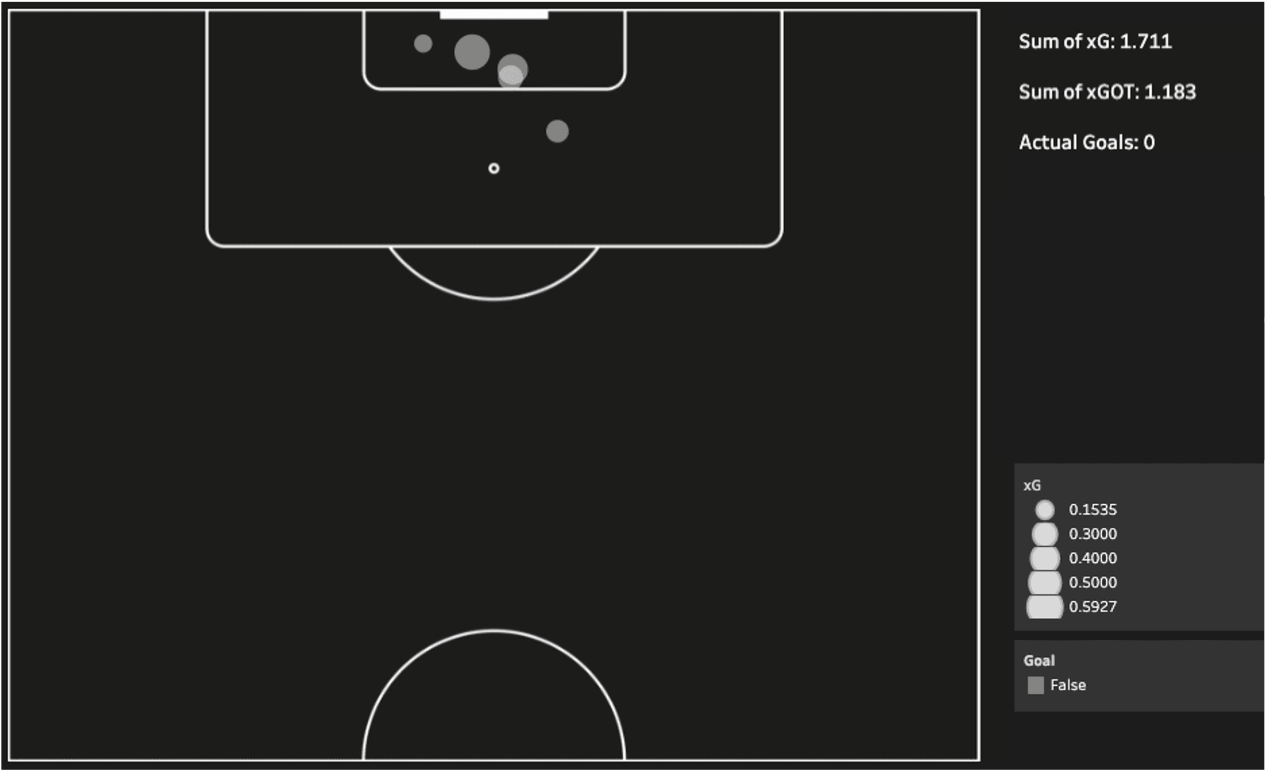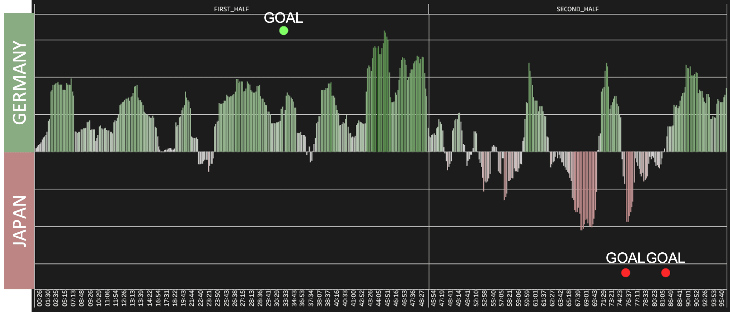 Ils ont contrôlé la première mi-temps, comme le montre le graphique de Domination du Match ci-dessous. Ceci est basé sur l'Expected Threat qui mesure la probabilité qu'avoir le ballon en un point du terrain mène à un but. Malgré leur domination, ils ont été incapables de marquer dans le jeu (leur but est venu d'un penalty transformé par Ilkay Gündoğan. Ils ont généré des occasions de but (avec un xG dans le jeu de 2,273), mais ont été contrecarrés par une solide performance de gardien de but de Gonda et une finition inefficace.