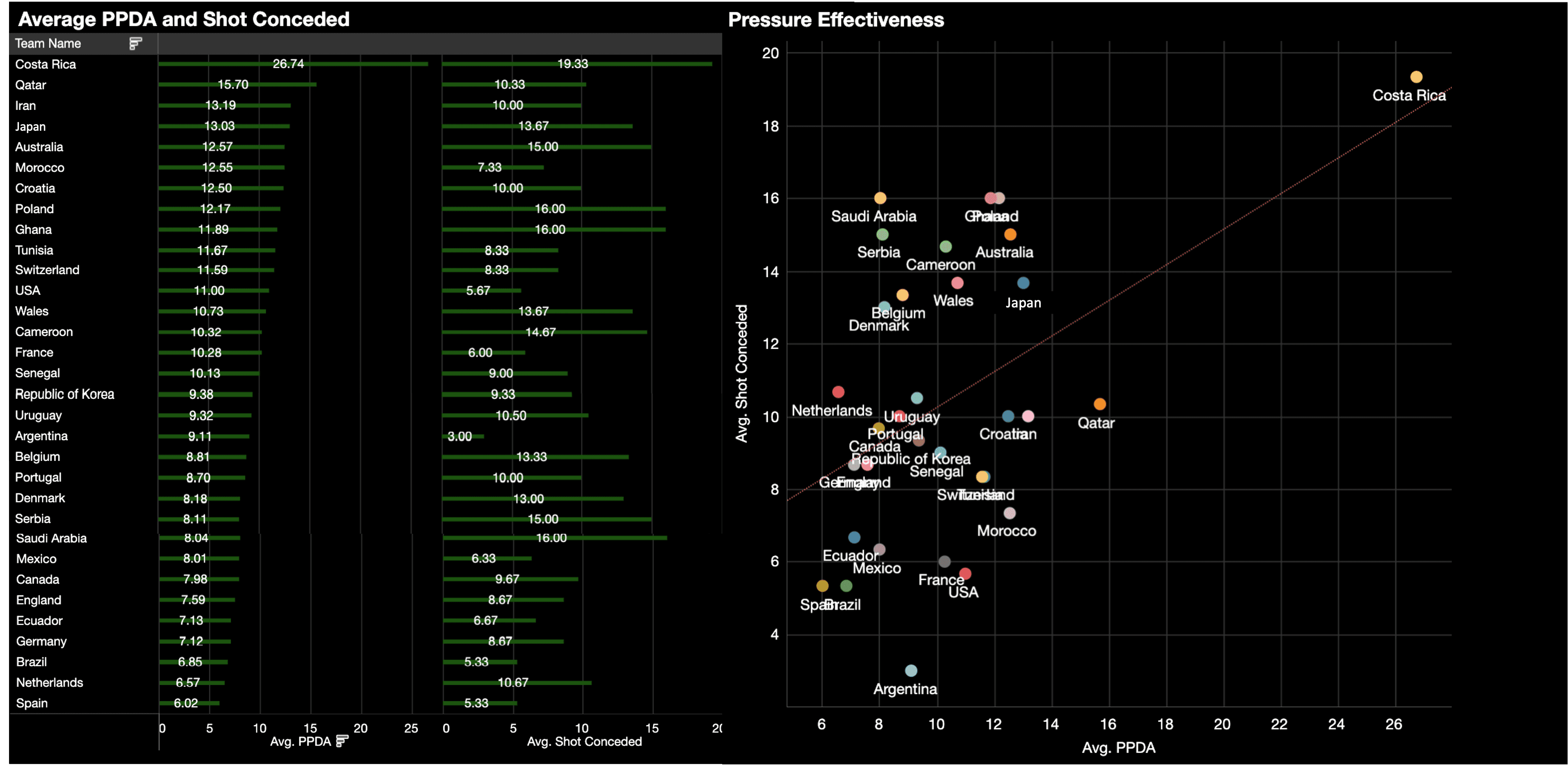 Peut-être sans surprise, l'Espagne a le plus petit nombre de passes par action défensive (PPDA), ce qui nous indique qu'elle est l'équipe qui presse le plus efficacement, en ce qu'elle limite ses adversaires à un faible nombre de passes par séquence (6,02). Fait intéressant, il n'y a pas de grande différence entre le PPDA des équipes qui se sont qualifiées et celles qui ne l'ont pas fait lorsque l'on retire le Costa Rica, qui est vraiment une anomalie ! Il sera intéressant de voir si cela offre un quelconque aperçu à mesure que le nombre d'équipes dans la compétition continue de diminuer.