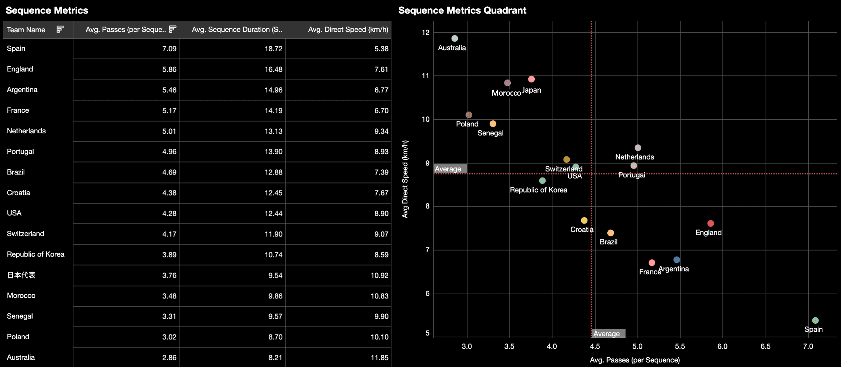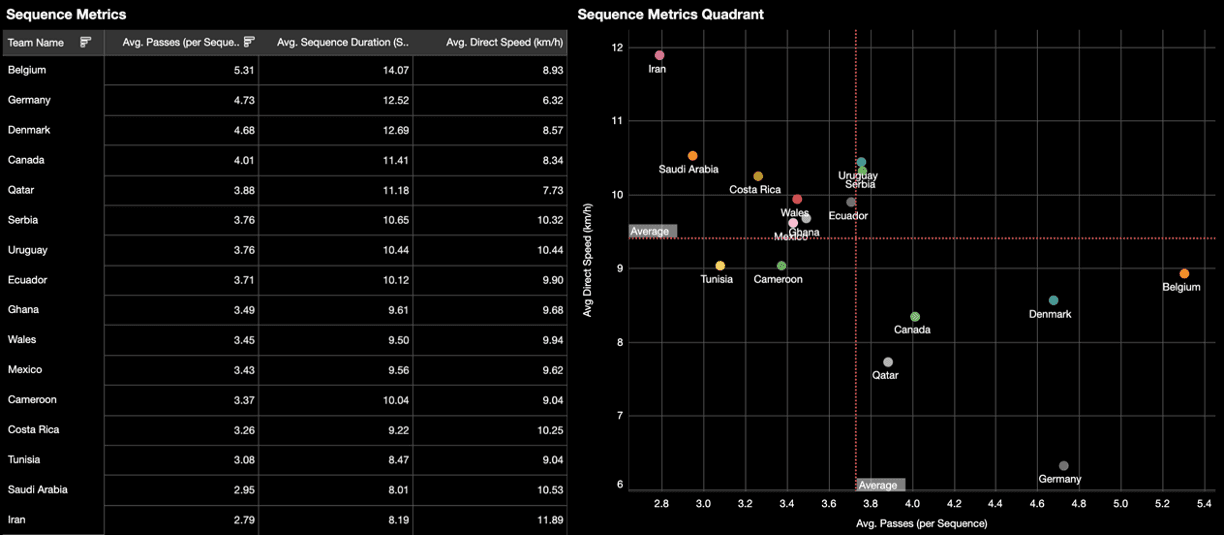 De manière intéressante ils sont l'équipe la plus directe restant dans le tournoi, si l'on considère les données de leurs séquences. Avec 2,86 passes par séquence et une vitesse directe de 11,85 km/h ils sont seuls dans leur catégorie, comme le montre le graphique ci-dessous.