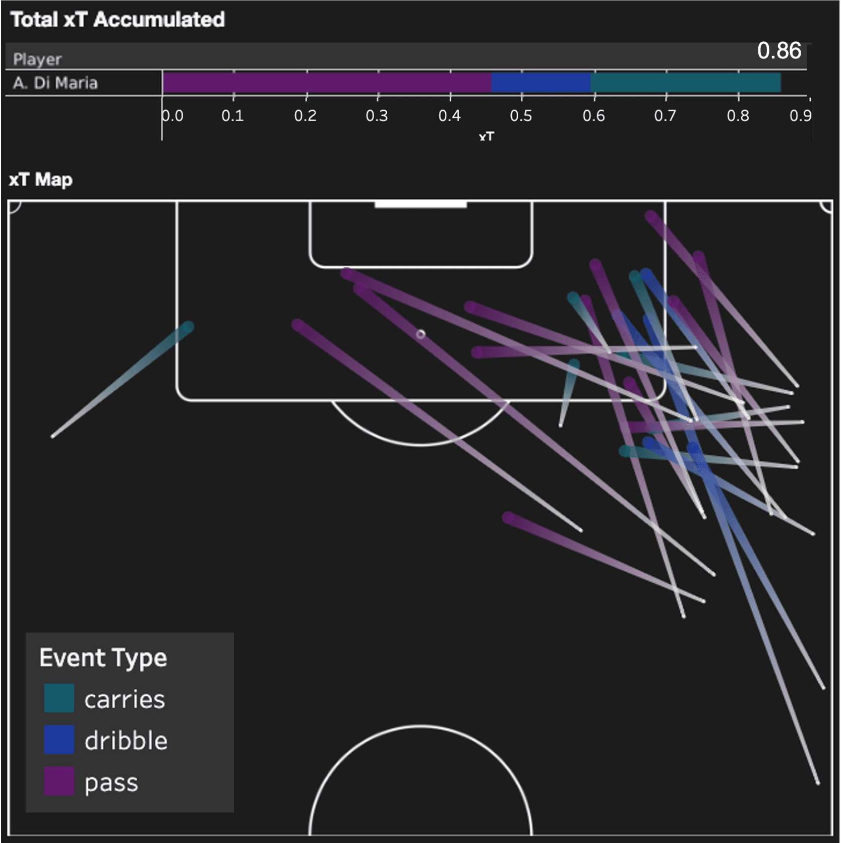 En revenant à l'Australie, ils affronteront l'Argentine, qui possède le joueur individuel ayant généré la menace attendue (xT) la plus élevée pendant la phase de groupes en la personne d'Angel Di Maria. Il a généré 0,86 xT, démontrant sa capacité à encore créer et à placer le ballon dans des zones dangereuses. Sa carte xT pour la phase de groupes de la Coupe du Monde montre comment sa capacité à repiquer depuis la droite, en utilisant son pied gauche dominant, cause de réels problèmes aux adversaires.